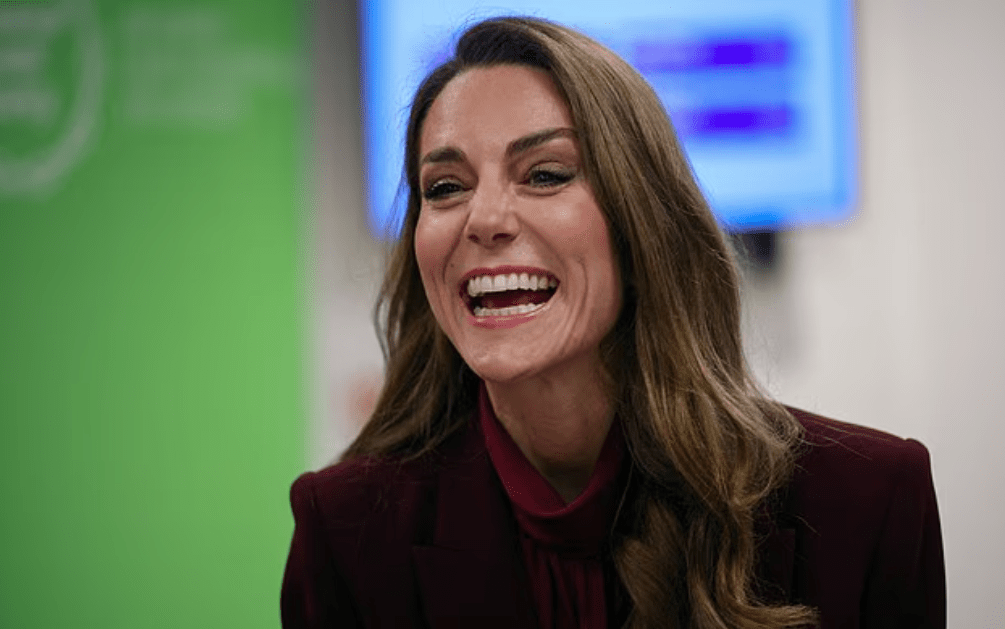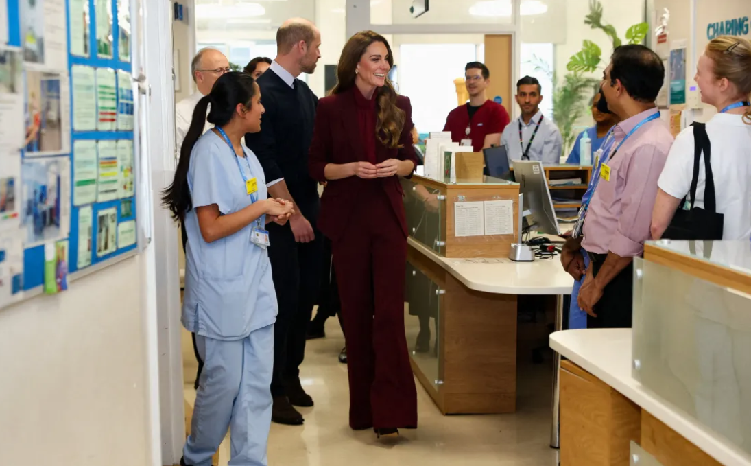 J’avoue qu’en regardant la première photo où Kate éclate de rire, je n’imaginais pas qu’elle visitait un service de cancérologie. Service qui n’est déjà drôle pour personne donc a fortiori pour les anciennes patientes chez qui cela ravive des souvenirs pénibles et douloureux dont la crainte de la récidive. Mais bon les éclats de rire, les tailleurs pantalon et les Lavallière font partie intégrante de la signature de Kate. Rien de nouveau pour 2026 visiblement.